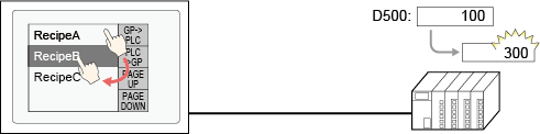 From the display unit, if you change RecipeB's element value and save this change, the value in the mapped address (D500) also changes.