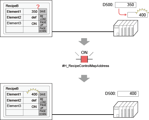When RecipeA is selected, the value in Element1 (100) is saved to the mapped address (D500); when Recipe B is selected, its Element1 value (300) is saved to the mapped address.