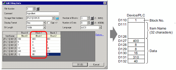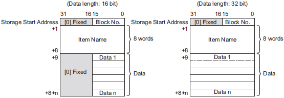 When transferring both the item name and block number to the device/PLC along with the data, it is stored with the following structure.