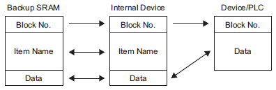 The block number is not transferred during a device/PLC to backup memory (SRAM) transfer. The same applies when transferring via the internal device (Device/PLC to Internal Device to SRAM).