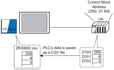 Also, when bit 1 of the Control Address turns ON, the device/PLC data is read and saved to the external storage device as new CSV data according to the previously set transfer conditions (Destination Address, Number of Data Items).