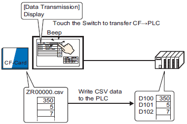 The recipe (CSV data) saved on the external storage device displays in a list on the display unit. Touch a file in the list to write the file to the device/PLC.
