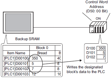 Designate the file no./block no. to transfer and turn ON the control address bit 0. The block data or recipe is written to the device/PLC.