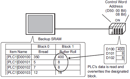 Designate the recipe to transfer and turn ON the control address bit 0 and bit 8. Data from the device/PLC is saved to backup memory (SRAM) and overwrites the designated recipe.