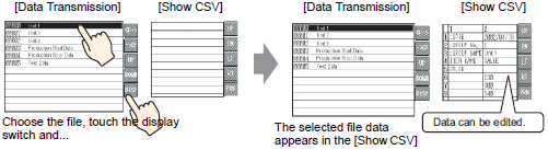 If you set up the Special Data Display [Show CSV] to allow editing of data, you can edit the displayed data by touch. Use this feature when you want to edit on the screen CSV data in external storage and write to the device/PLC.