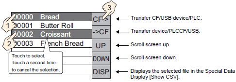If both a Special Data Display [Data Transmission] and [Show CSV] are placed on the same screen and you select a file and press the display switch, CSV Data Recipes appear in the [Show CSV].