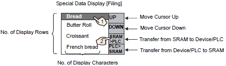 In the Special Data Display [Filing] on the screen of the display unit, the item names of registered blocks in the files specified in the backup memory (SRAM) (File#0) are displayed in a list.