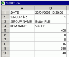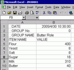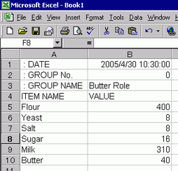 Open Microsoft Excel and enter items ":DATE", ":Group NO.", ":GROUP NAME", "ITEM NAME", and "VALUE" to the appropriate locations and enter the recipe data.