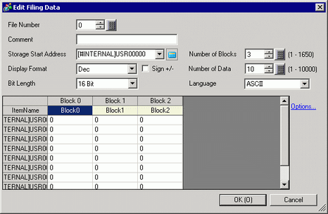 Set the number of blocks (recipes) to register in the file. Up to 1650 blocks can be saved in one file. The number of blocks that can be set depends on the [Number of Data Items].
