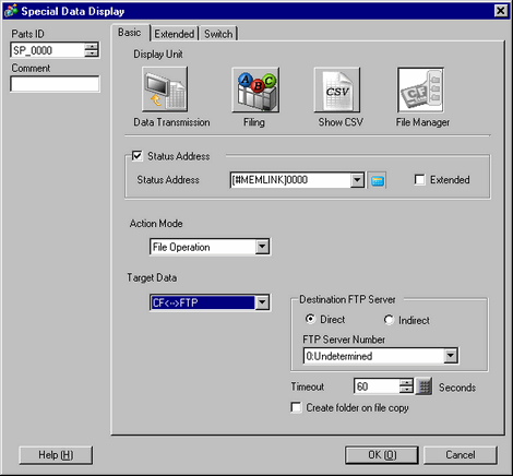 In [Action Mode], select [File Operation]. In [Target Data], select [CF<-->FTP] (or [SD<-->FTP]) or [USB Storage<-->FTP]. While transferring data to the CF/SD Card/USB Storage using FTP, specify whether to write the transfer information in the specified status address.
