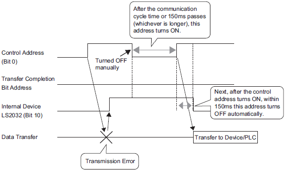 If data cannot be transferred between the PLC and backup memory (SRAM), the internal device for the Special Relay Area LS2032 bit 10 turns ON. To transfer data again, turn OFF the [Control Word Address] bit 0 temporarily. Then, after setting the communication cycle time as either your standard communication cycle time or 150ms (whichever is longer), turn it ON.