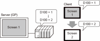 Mapped to the device/PLC, when bit 15 (forced screen change bit) of the System Data Area's [Change-To Screen] address is ON, change screen operation on the client via the change screen switch is unavailable. However, screen changes from the screen number control address operate.