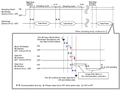 When data has been sampled from the Cycles x Blocks, the designated [Data Full Bit Address] is turned ON. Please confirm that this bit is ON and turn ON the [Data Clear Bit Address].