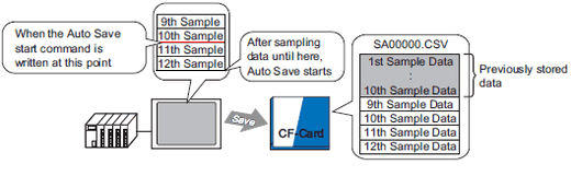 Sampling data that is stored in the display unit is output to the CSV file after sampling for the designated cycles finishes, not when writing the Auto Save command.