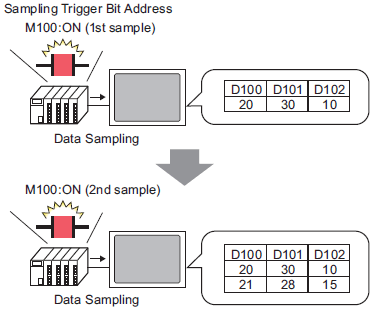 Sample data from the designated Occurrences, and set whether to overwrite the oldest data and store the new data the next time the designated bit turns ON, or to stop sampling.
