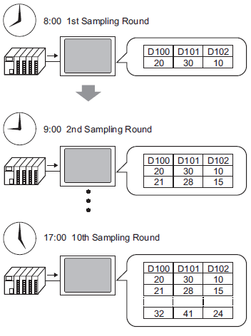 Read the designated address value from the device/PLC at a fixed interval and save that data in the display unit.