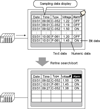 You can also sort the collected data on the display unit, or use the Refine Search function to display the data records that match the specified conditions.