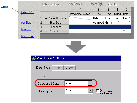 8. Select the third row and click [Row Details]. The [Calculation Settings] dialog box appears. Change the [Calculated Data] to [Max].