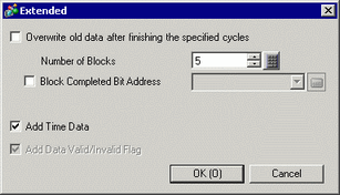 If you clear the [Overwrite old data after finishing the specified cycles] check box, you can adjust the [Number of Blocks] setting. A "block" is the sampling data collected from the designated Occurrences. When displaying or printing data, you can use block units. When the defined data is stored ([Occurrences] x [Blocks]), after that sampling will not run even if the defined bit turns ON.