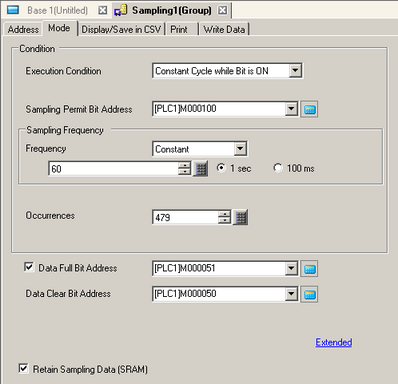 In the [Data Clear Bit Address] field, enter the address (for example, M50) to delete the collected data. When this bit is turned ON, all data from sampling group 1 stored in the display unit are deleted.