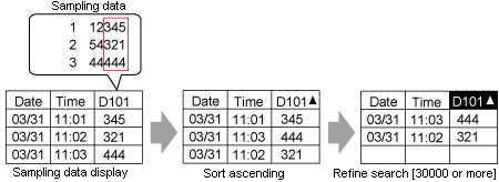 The number of digits you specify in the [Total Display Digits] should be larger than the number of digits of actual sampled data. Search and sort operation is performed based on the sampled data. If the actual number of digits is more than the display digits specified, the result shown on display will not match the condition you specified.
