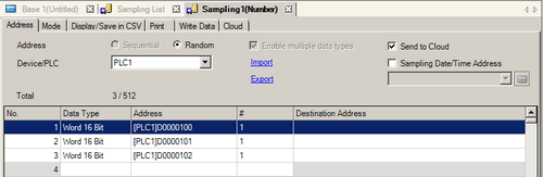 Open the Sampling Group's [Address] tab, define the addresses to sample and corresponding data format, and select the [Send to Cloud] check box.