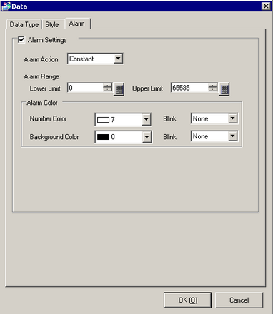 Designate whether or not to display an alarm (change the data color when the value goes outside of the alarm range).