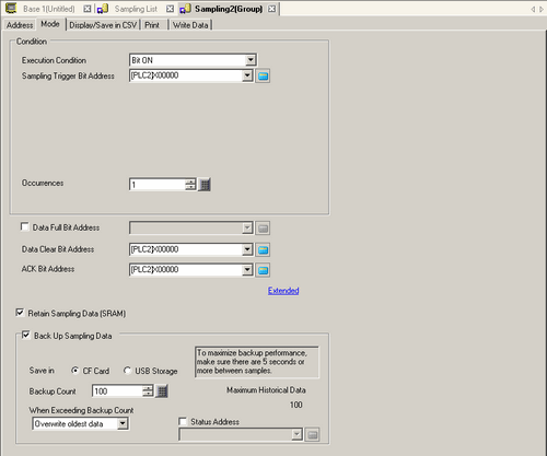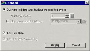 In the Extended area, when the [Overwrite old data after finishing the specified cycles] check box is selected, this bit tells when a data sampling cycle has been done. The sampling operation will continue running even when this bit is ON. If not designated, the sampling action will end when this bit turns ON. Please turn ON the [Data Clear Bit Address] to resume.