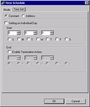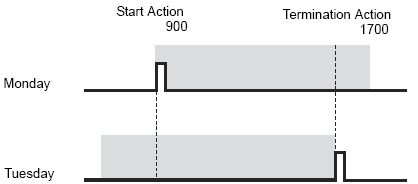 The Time Schedule is for one day only, so if the End Time is entered as being before the Start Time, the End Time is performed on the next day.