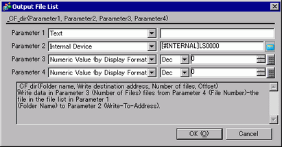 The list of files that exist in the specified folder is written in the Internal Device. Parameter 1 indicates the CF Card data folder. Parameter 4 indicates the offset used to select a file/files within that folder. Parameter 3 indicates the number of files selected within that folder. Parameter 2 specifies the LS Area into which the files will be written. When the offset is specified as "0", the list starts from the first file.