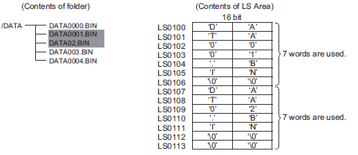 When the statement above is executed while the following files exist in the DATA folder, file names "DATA0001.BIN" and "DATA02.BIN" are written to LS0100 and later areas.