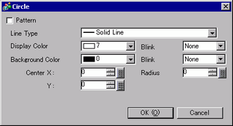Draws a circle at the designated point. When you select the [Pattern] check box, a filled circle is drawn. Select and enter the line type (or fill pattern when selecting a pattern), color attributes, center coordinates, and radius value. Center coordinates and radius can be set indirectly.
