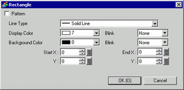 dsp_rectangle (Start Point X Coordinate, Start Point Y Coordinate, End Point X Coordinate, End Point Y Coordinate, Display Color Blink + Display Color, Background Color Blink + Background Color, Pattern and Line Type)