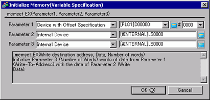 Initializes all devices at once. The Set data specified with Parameter 2 are set from the Set Word Address specified with Parameter 1 into the addresses specified with Parameter 3. The valid range for the number of addresses is from 1 to 640. The Write-To Address, Write Data, and number of addresses can each be designated indirectly.
