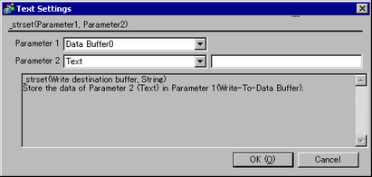 A fixed string is stored in the data buffer. Stores the data of Parameter 2 (Text) in Parameter 1 (Write-To Data Buffer).