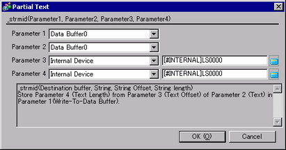 Data are retrieved from the specified offset of the string according to the length of the string and stored in another data buffer. Store Parameter 4 (Number of words) from Parameter 3 (String Offset) of Parameter 2 (String) in Parameter 1 (Destination buffer).