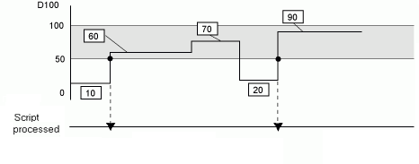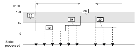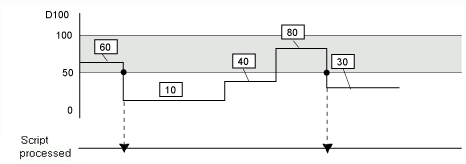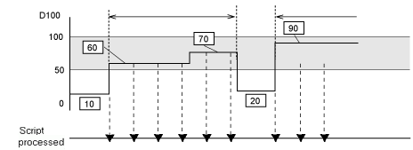 For example: When the Trigger Condition is 100 > [D100] > 50,*3 the script will execute with the following timing.