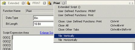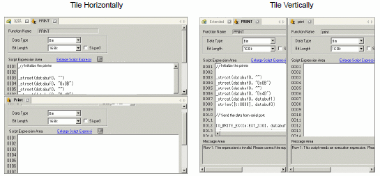 Right-click the tab in the script or user defined function and select either [Tile Vertically] or [Tile Horizontally] to split the screen.