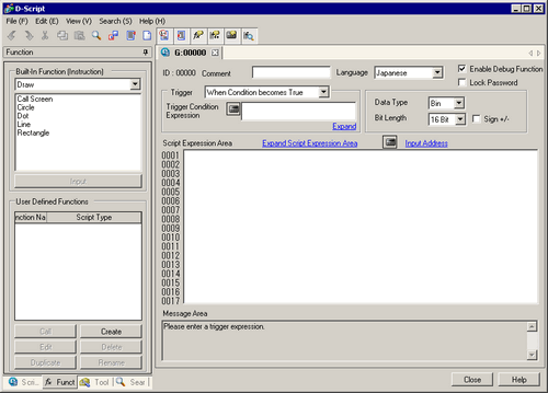 Select the trigger condition to run scripts from [Continuous Action], [Timer], [When Bit turns ON], [While Bit is ON], [When Bit turns OFF], [While Bit is OFF], [On Bit Change], [When Condition becomes True], [While Condition is true], [When Condition becomes False], [While Condition is False]. For more information about this function, please refer to the following.