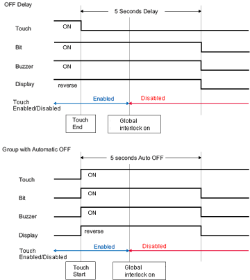 When global interlock is enabled (touch is disabled) while a switch delay or automatic off function is running, there are cases where the switch operation will end and cases when the switch operation will continue.