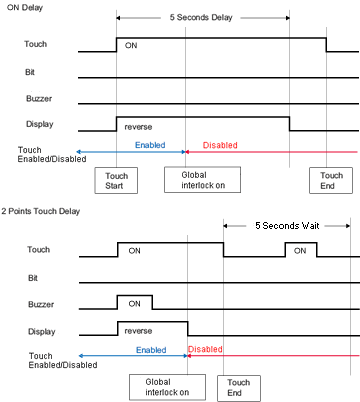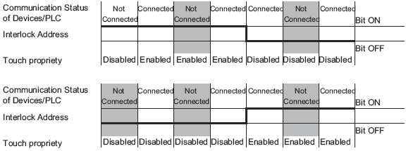 When the address of the external Device/PLC is designated as the global interlock address, Touch Enable Condition cannot be determined until the connection with that Device/PLC is established. Therefore, regardless of [Enable when Bit is ON]/[Enable when Bit is OFF], the global interlock will be enabled.