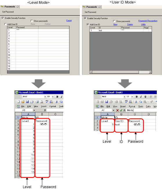 Output data differs depending on the [Add User ID] settings' "Level Mode" or "User ID Mode".