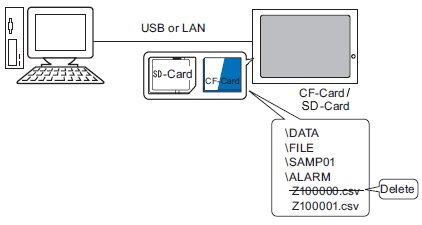 For example, Delete CF/SD Card Alarm data (Z100000.csv).