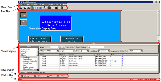 This is the area for displaying [Address View], [Logic View], [I/O View] and [Function View].