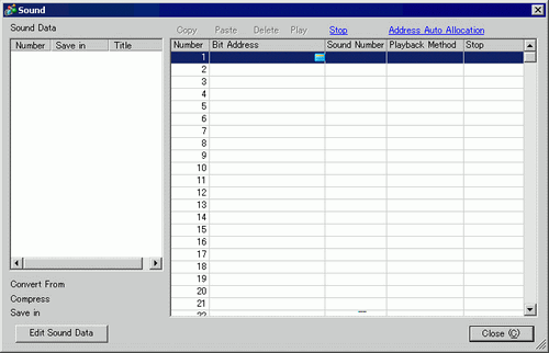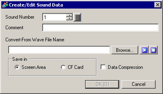 The [Create/Edit Sound Data] dialog box opens. Specify the [Sound Number] and [Comment]. (For example, [Sound Number] 1, [Comment] test)