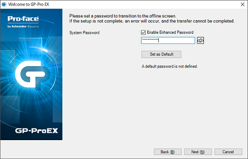 Click [Set as Default] to register the enable/disable setting of the [Enable Enhanced Password] as the default value. The next time you create a project, the registered settings are used as the initial values.