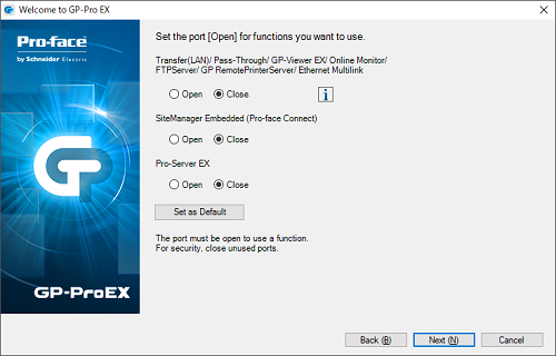 The following screen is displayed. Set [Open] the port of the function you want to use, then click [Next].