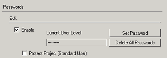 To change the project protection level, in the [Set Password] dialog box select the user level with the [Startup User] setting.