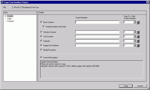 Specifies screens to copy from a different project file.
