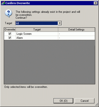When you select [Disable] in the Common Settings and the same ID exists in the open project and another project, it will be shown in the list. When you check the [Overwrite] check box and click [OK], the settings of the current project (Copy To) are overwritten with those of the other project (Copy From). When you uncheck [Overwrite] and click [OK], the settings of the current project (Copy To) are not overwritten.